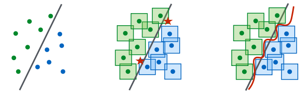 [그림3] 표준 decision boundary와 적대적 decision boundary의 개념도. 왼쪽은 간단한 decision boundary로 쉽게 분류 가능한 점들의 집합임. 가운데는 데이터 포인트를 둘러싸는 $\ell_\infty$-ball(사각형)을 분류하지 못하는 단순한 decision boundary. 따라서 적대적 예제들(빨간 별)이 오분류된다. 오른쪽은 $\ell_\infty$-ball을 분류하기 위한 더 복잡한 decision boundary임. 해당 분류기는 유계 $\ell_\infty$-norm 교란의 적대적 예제에 대해 robust하다.