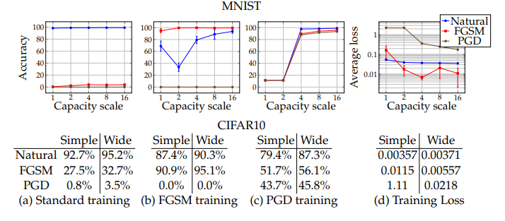 [그림4] network의 성능에서의 network capacity의 영향. 다양한 capacity에서 MNIST와 CIFAR10 network를 훈련하였다. (a)는 일반적인 입력이고, (b)는 FGSM이 만든 적대적 입력들, (c)는 PGD가 만든 적대적 입력이다. 각 데이터셋의 첫 세 개의 그림과 표에서, 표준과 적대적인 각각의 훈련 체제 하에서의 capacity에 따른 정확도의 변화를 보였다. 마지막 그림과 표에서는, network가 훈련된 적대적 입력들의 cross-entropy loss의 값을 보였다. 이는 허용된 교란들의 여러 집합들에 대한 말안장점 문제(2.1)의 값에 해당한다.