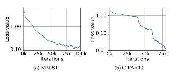 [그림5]: 훈련시키는 동안 적대적 예제에 대한 training loss. 이 그림들은 PGD adversary에 대한 MNIST와 CIFAR10 network의 훈련 예제에서의 adversarial loss가 어떻게 진행되는지 보여준다. CIFAR 10그림에서의 급격한 감소는 훈련 step 크기를 감소시킨것에 해당한다. 이 그림들은 지속적으로 말안장점 문제 (2.1)의 내부 문제의 값을 감소시키는 것을 보여주고, 따라서 robust 분류기를 향상적이게 생성하고 있다.