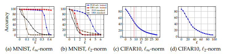 [그림6]: 다양한 강도의 PGD adversary들에 대해서 적대적으로 훈련 network의 성능. MNIST와 CIFAR10 network는 각각 $\epsilon=0.3$과 $\epsilon=8$의 PGD $\ell_\infty$ adversary에 대해서 훈련되었다. (이 훈련 $\epsilon$은 $\ell_\infty$플롯에서 빨간 점선으로 표현된다. MNIST에서 적대적으로 훈련된 network의 사례에서, 우리는 표준적인 2000스텝의 Decision Boundary Attack(DBA) [4]와 PGD, 그리고 각각에 대해서 적대적으로 훈련된 모델을 평가하였다. 우리는 훈련에 사용된 $\epsilon$의 값보다 작거나 같을 때, 성능이 크거나 같다는 것을 관찰하였다. MNIST에서는 짧은 진행 후 날카롭게 떨어졌다. 더욱이, MNIST에서 PGD를 사용한 $\ell_2$-trained network의 성능이 좋지않고, 모델의 robustness를 크게 과대평가하고 있다는 것을 관찰했다. 이는 모델이 학습한 threshold filter가 loss 그레디언트를 masking하는 것에 기인할 가능성이 있다. (decision-based attack은 그레디언트를 이용하지 않는다.)