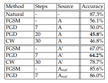 [표2]: CIFAR10: $\epsilon=8$의 다양한 adversary에 대해서 적대적으로 훈련된 모델들의 성능. 각 공격 모델에 대해서 가장 효과적인 공격은 볼드체로 표시하였다. 공격을 위해 고려된 source network는 다음과 같다: 이 network 자체 (A) (white-box attack), 독립적으로 초기화되고, 이 모델의 훈련된 복사본 (A’), 일반적인 입력에서 훈련된 network의 복사본 ($A_{nat}$)
